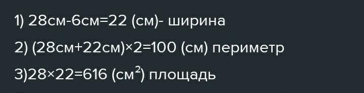 Длина прямоугольника 28 см, а ширина на 6 см меньше. Его периметр равен периметру прямоугольнику см. Находить площадь прямоугольника