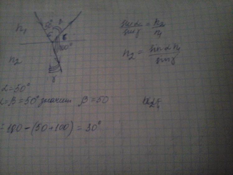 Луч света падает на плоскую границу раздела двух сред. Угол падения равен 500, угол между отраженным лучом и преломленным 1200. Чему равен угол преломления?