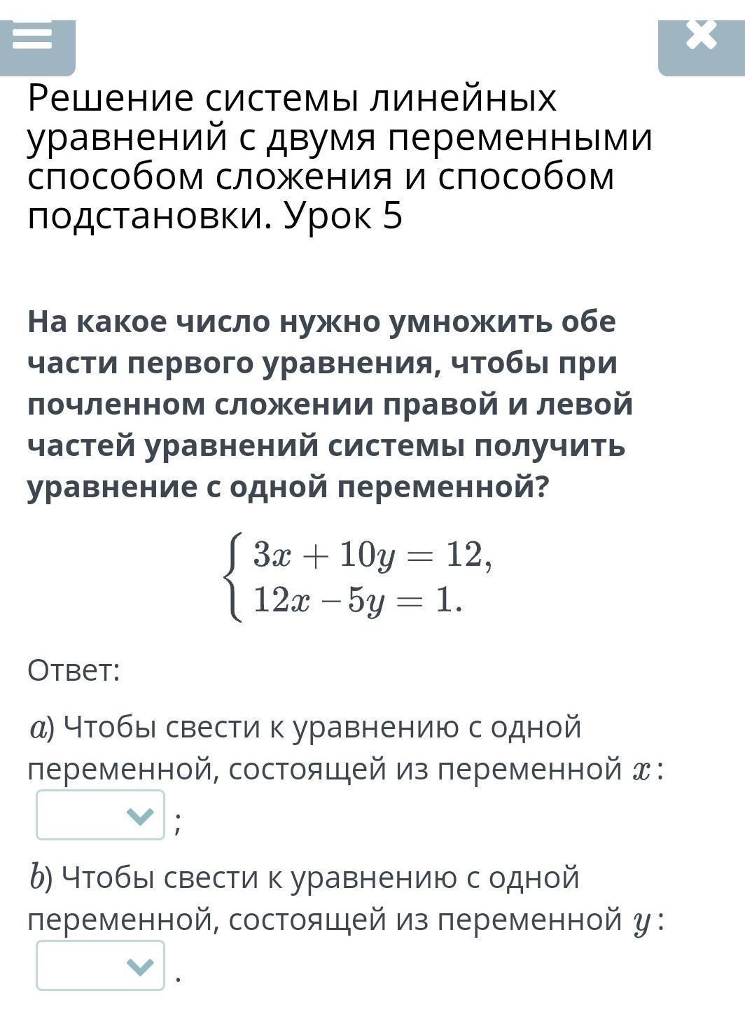 На какое число нужно умножить обе части первого уравнения, чтобы при почленном сложении правой и левой частей уравнений системы получить уравнение с одной переменной?