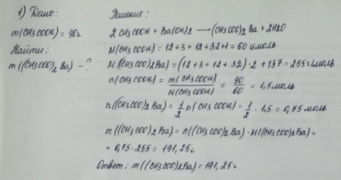 ДАЮ 45 БАЛОВ Етанова кислота масою 90 г прореагувала з барій гідроксидом. Зробіть необхідні обчислення й укажіть масу (у грамах) солі, що утворилась.