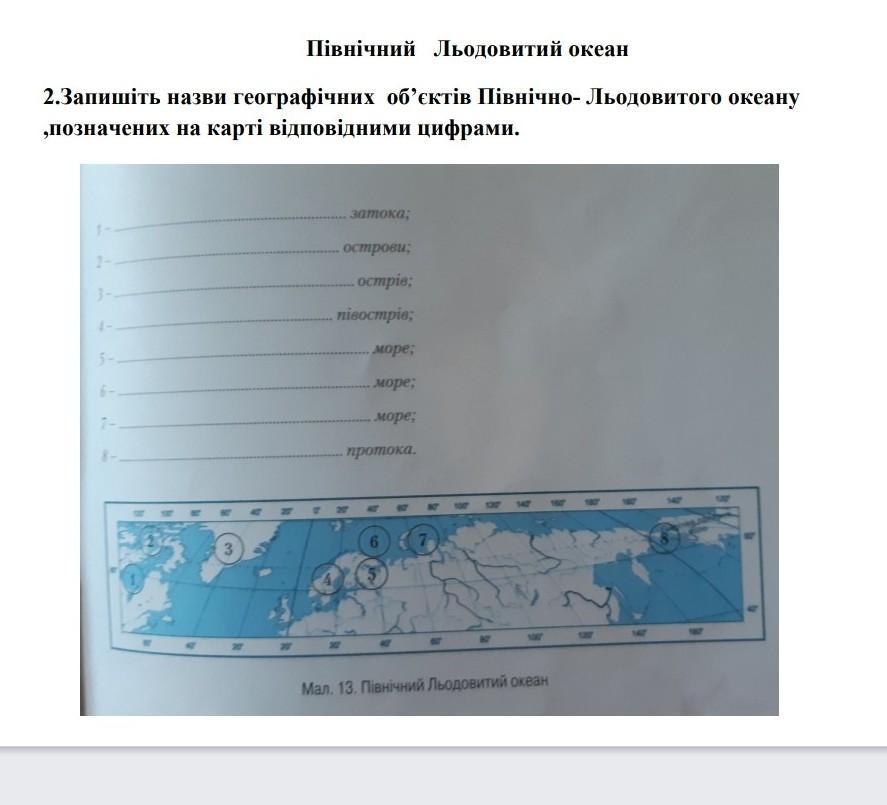 2.Запишіть назви географічних об'єктів Північно-Льодовитого океану позначених на карті відповідними цифрами.