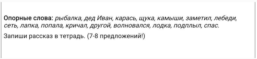 Дед Иван отправился на рыбалку. Сегодня был хороший улов, он поймал щуку и карася. Но вдруг дед услышал громкий крик птицы. Иван решил найти этого крикуна, поэтому стал пробираться на лодке сквозь камыши. Осмотревшись по сторонам он увидел двух лебедей. Один застрял лапкой в рыбацкой сетке ,а другой летал вокруг и волновался за него. Рыбак подплыл к сетке и тут же спас птицу. ,,Надеюсь вы больше не будете попадать в передряги’’-крикнул он им вслед.