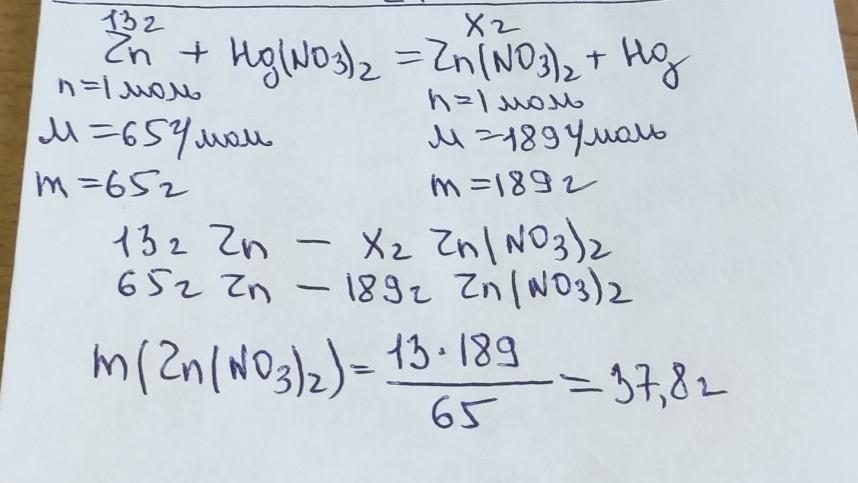 Вычислите массу соли, которая образуется при взаимодействии 13г цинка Zn с нитратом ртути Hg(NO3)2.