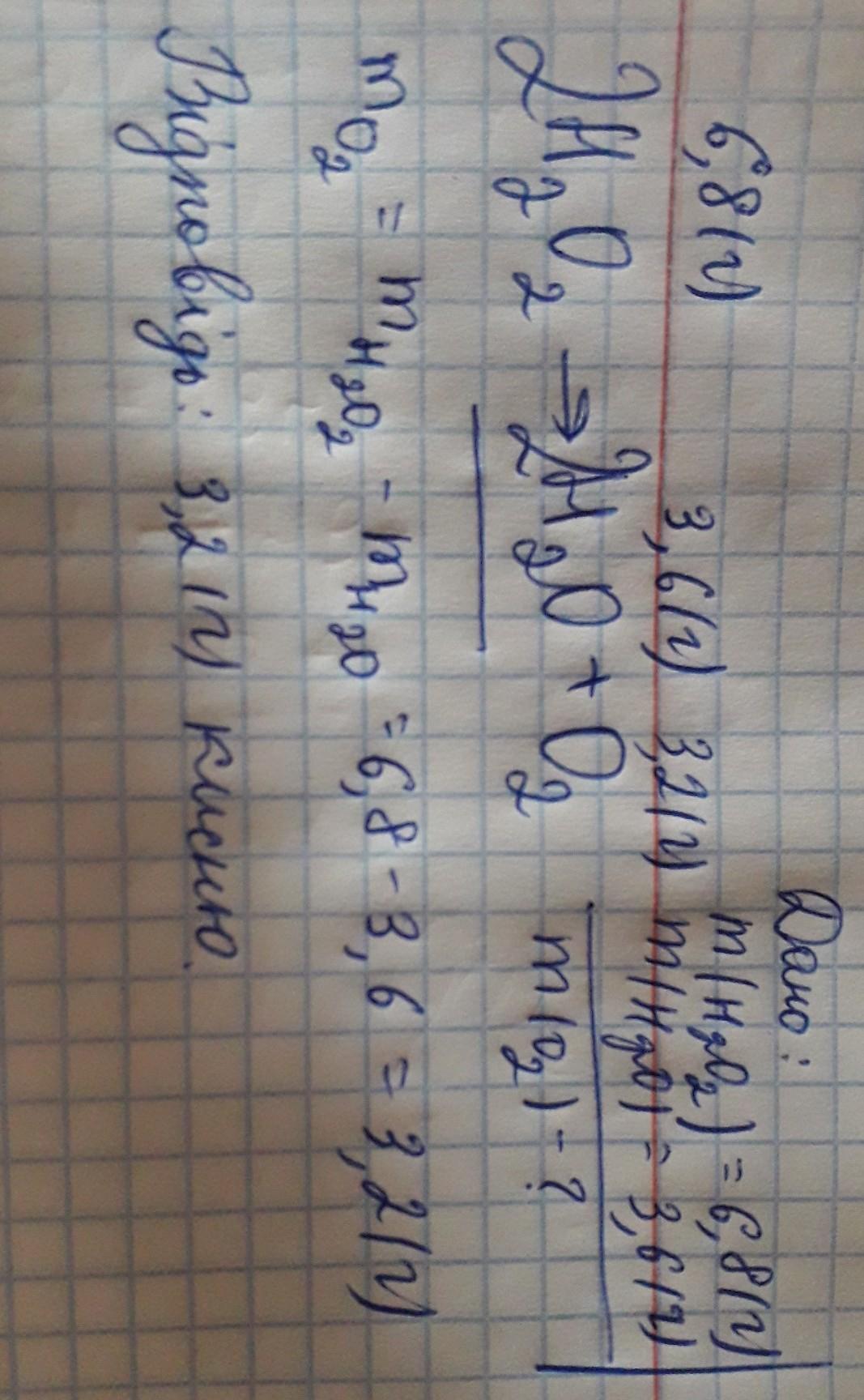 При каталітичному розкладі 6,8 грама гідроген пероксиду утворилося 3,6 грама води та кисень.Яка маса кисню утворилася.Напишіть рівняння реакції,зробіть відповідні обчислення
