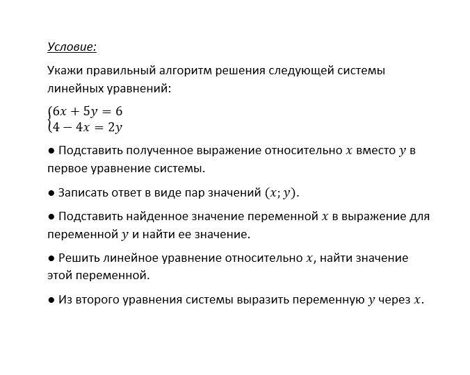 Укажи правильный алгоритм решения следующей системы линейных уравнений:
