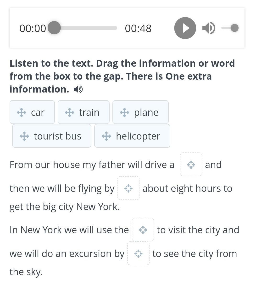 помогите пожалуйстаListen to the text. Drag the information or word from the box to the gap. There is One extra information.