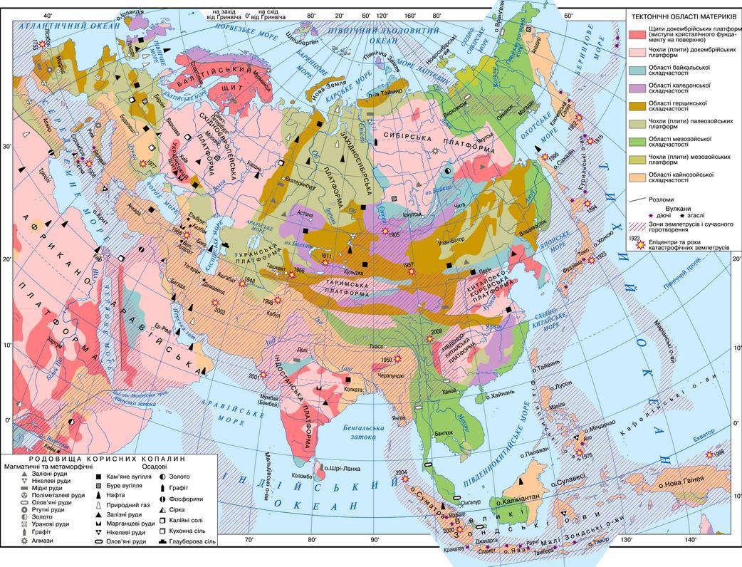 На тектонічній карті, діючі вулкани, позначається рожевою зірочкою.