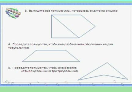1 рисунок. выпишите все прямые углы которое видите на рисунке. 2 рисунок. Проведите прямую так чтобы она разбила четырехугольник на два треугольника. 3 рисунок.проведите прямую так чтобы она разбила четырёхугольник на три треугольника.