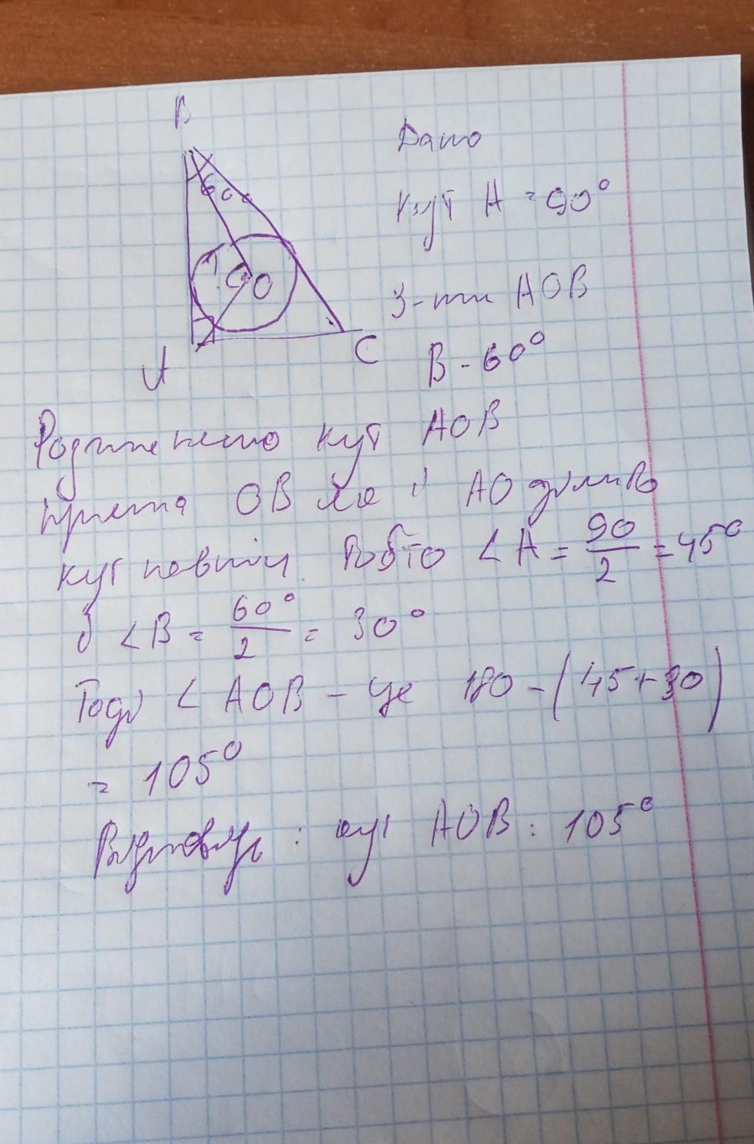 Коло з центром у точці О дотикається сторін прямокутного трикутника АВС (кут A 90°). Знайдіть кут АОВ, якщо відомо, що кутB-60°.