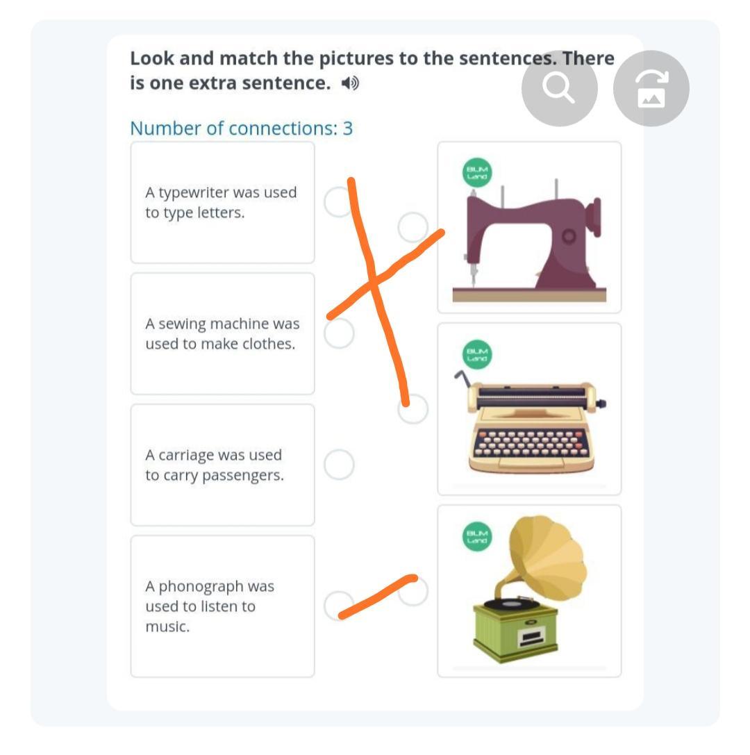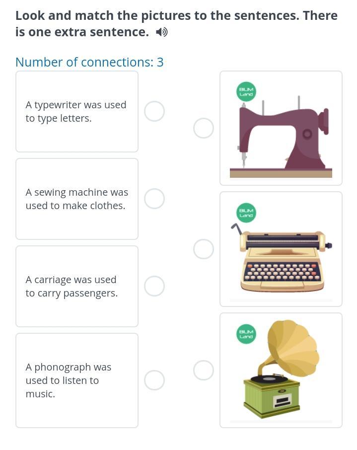 Look and match the pictures to the sentences. There is one extra sentence. 4 Number of connections: 3 A typewriter was used to type letters. A sewing machine was used to make clothes. A carriage was used to carry passengers. BLM Land BLM Laand BLM A phonograph was used to listen to music.