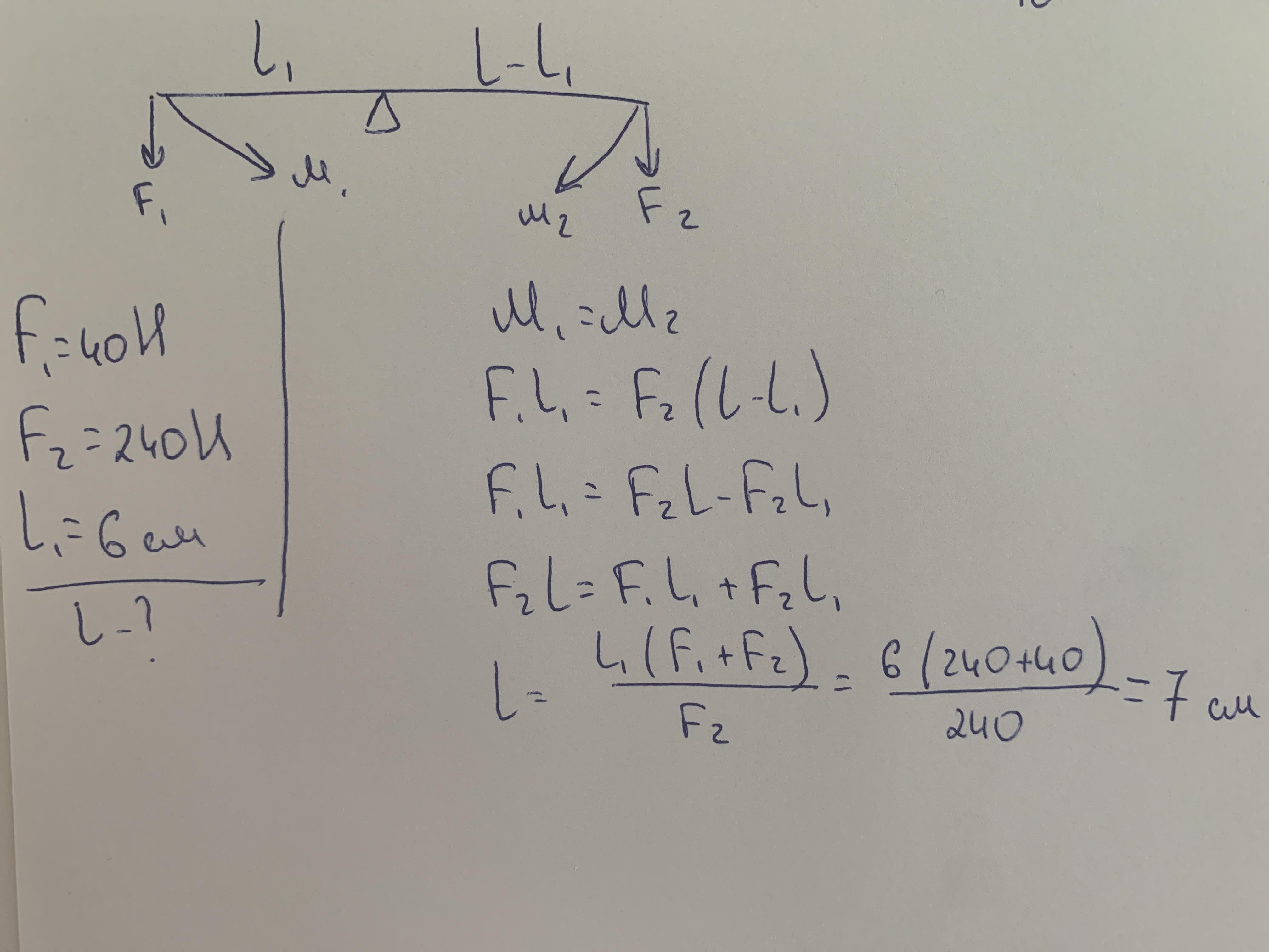 на кінці важелля діють сили 40 і 240H.Відстань від точки опори до меншої сили 6см.Визначте довжину важелля, якщо він перебуває в рівновазі