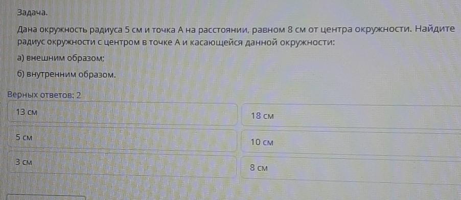 Дана окружность радиусом 5 см и точка A расстояние равна 8 см от центр окружности найдите радиус окружности с центром в точке A и касающиеся данной окружности внешним образом б внутренним образом