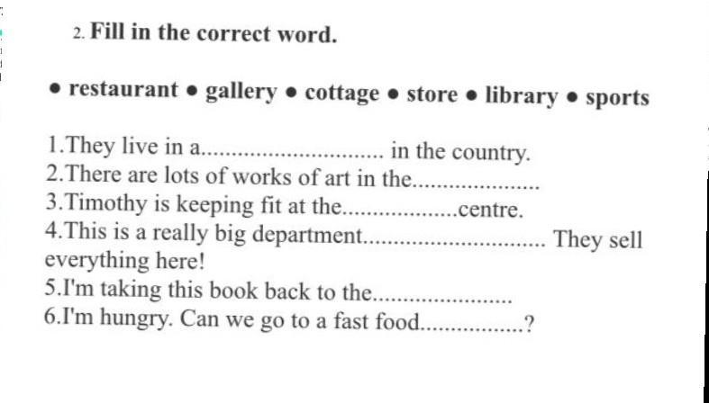 2. Fill in the correct word. • restaurant • gallery • cottage • store • library • sports 1.They live in a. 2.There are lots of works of art in the.. 3.Timothy is keeping fit at the. . 4.This is a really big department... everything here! 5.I'm taking this book back to the.. 6.I'm hungry. Can we go to a fast food.. in the country. ...centre. They sell