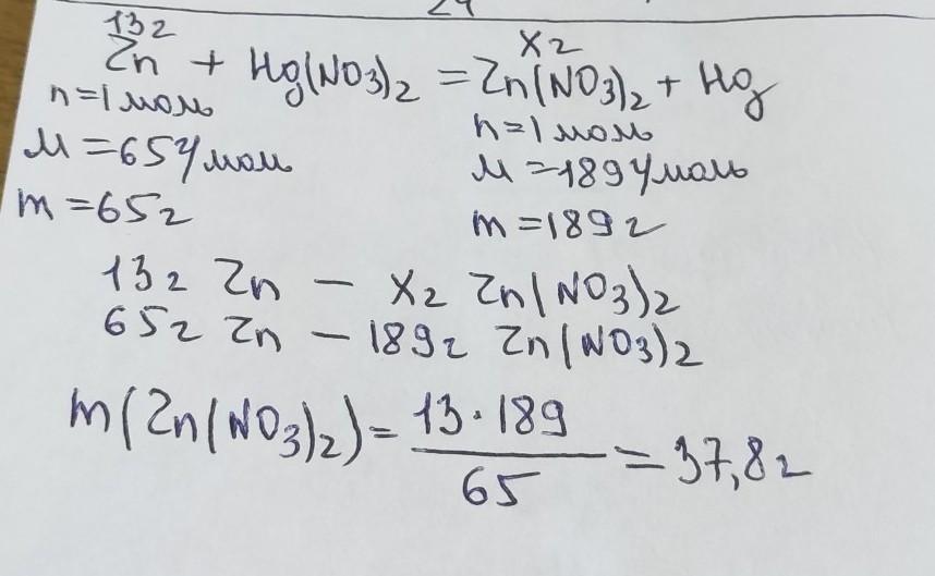 Вычислите массу соли, которая образуется при взаимодействии 13г цинка Zn с нитратом ртути Hg(NO3)2.