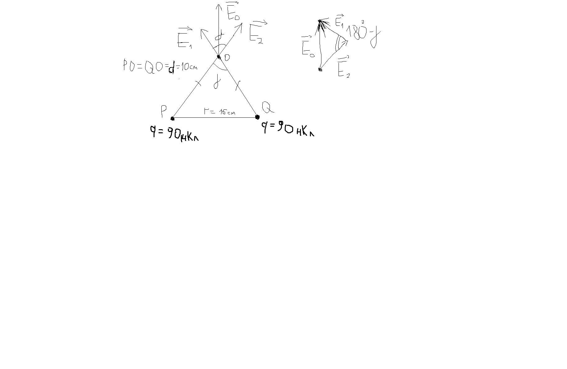 Е₁ = Е₂ = kq/d² - напряженность электростатического поля каждого из зарядов в точке О, равноудаленной от обоих зарядов на d = 10 см.