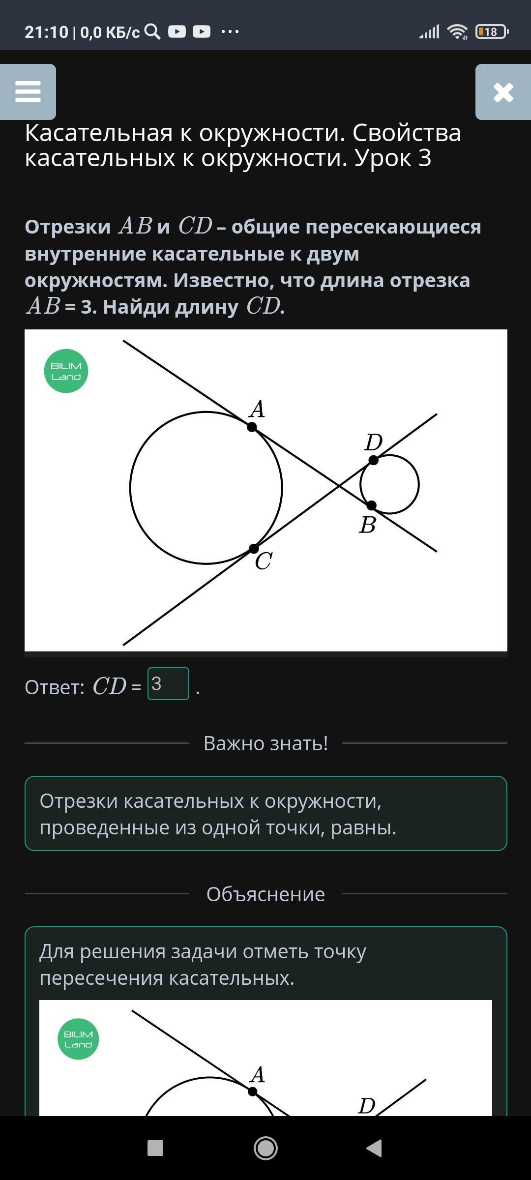 Отрезки AB и CD – общие пересекающиеся внутренние касательные к двум окружностям. Известно, что длина отрезка AB = 3. Найди длину CD.
