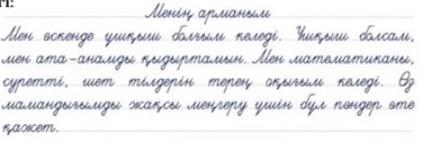 Мен өскенде дәрігер болғым келеді.Дәрігер болсам,мен ата-анамды емдетемін.Мен математиканы, биологияны, шет тілдерін терең оқығым келеді.Өз мамандығымды жақсы меңгеру үшін бұл пәндер өте қажет.