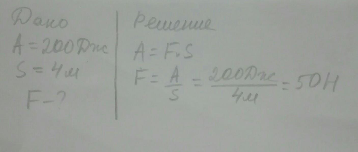 Тело совершило работу 200 Дж, пройдя путь 4 м. Определите силу тяги?
