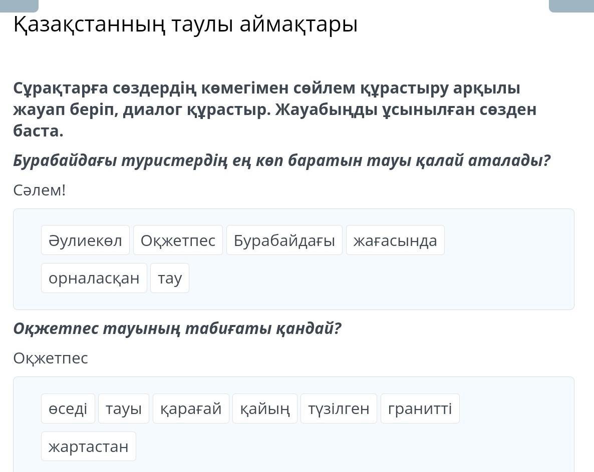 Сұрақтарға сөздердің көмегімен сөйлем құрастыру арқылы жауап беріп, диалог құрастыр. Жауабыңды ұсынылған сөзден баста.