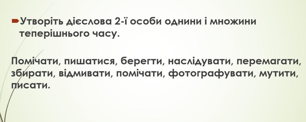Відповідь:помічаєш, помічаєте;пишаєшся, пишаєтесь;бережеш, бережете;наслідуєш, наслідуєте;перемагаєш, перемагаєте;збирає, збираєте;відмиваєш, відмиваєте;помічаєш, помічаєте;фотографуєш, фотографуєте;мутиш, мутите;пишеш, пишете