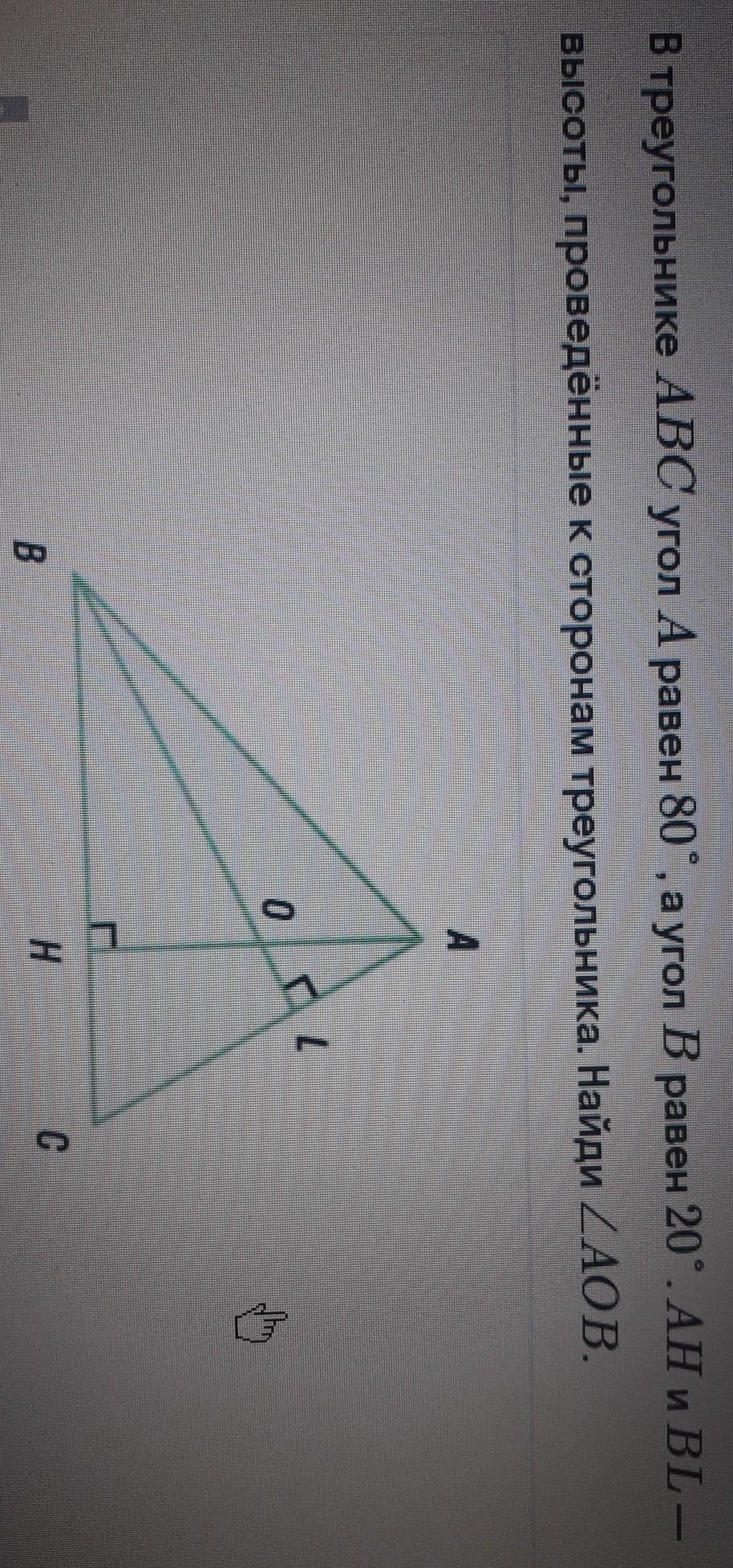 В треугольнике ABC угол A равен 80°, а угол B равен 20°. AH и BL - высоты, проведённые к сторонам треугольника. Найди угол AOB.