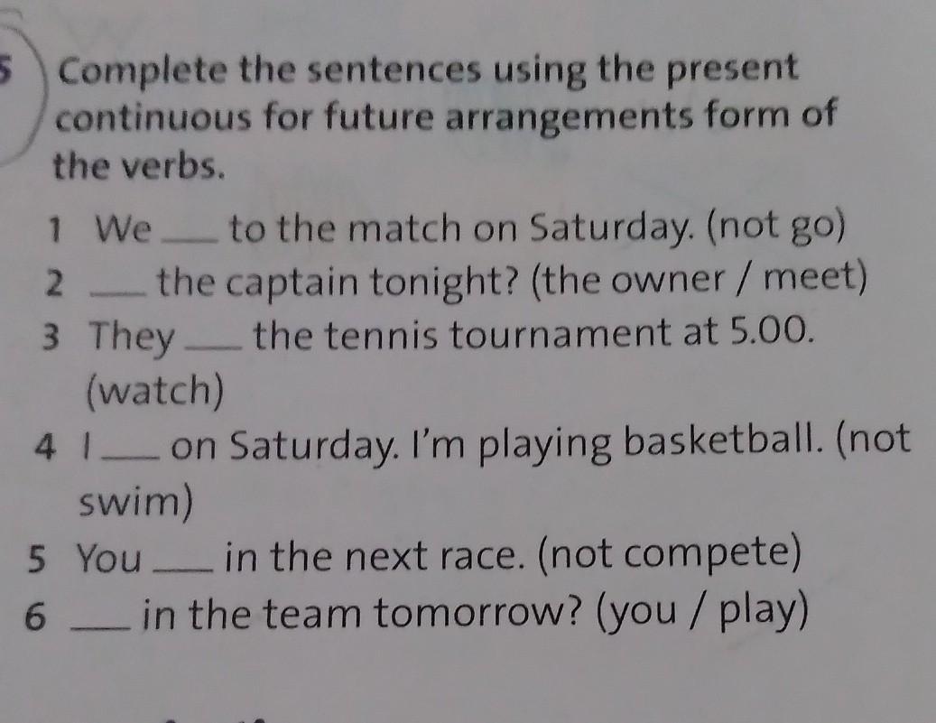 5 Complete the sentences using the present continuous for future arrangements form of the verbs.