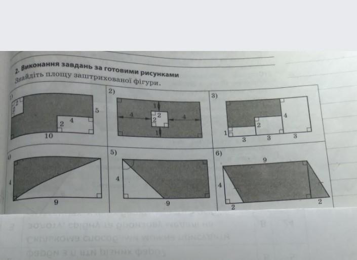Объяснение: 1)S=10*5-2*2-2*4=38 ; 2)S=4*10-2*2=36 ; 3)S=9*4-4*3-2*3-3*1=15 4)S=1/2ah=9*4:2=18 5) так в белом треугольнике углы раны и их сумма равна 90 то один из них 90/2=45 найдем другой угол х=180-90-45=45 значит это прямоугольно равнобедренный треугольник значит его вторая сторона равна 4 тогда площадь треугольника равна 1/2*4*4=8 1/2*4*4=8 теперь найдем площадь закрашенной части S=9*4-8=28 6) Sможно заметить что белый треугольник равен черному тогда надо просто найти площадь прямоугольника равна 9*4=36