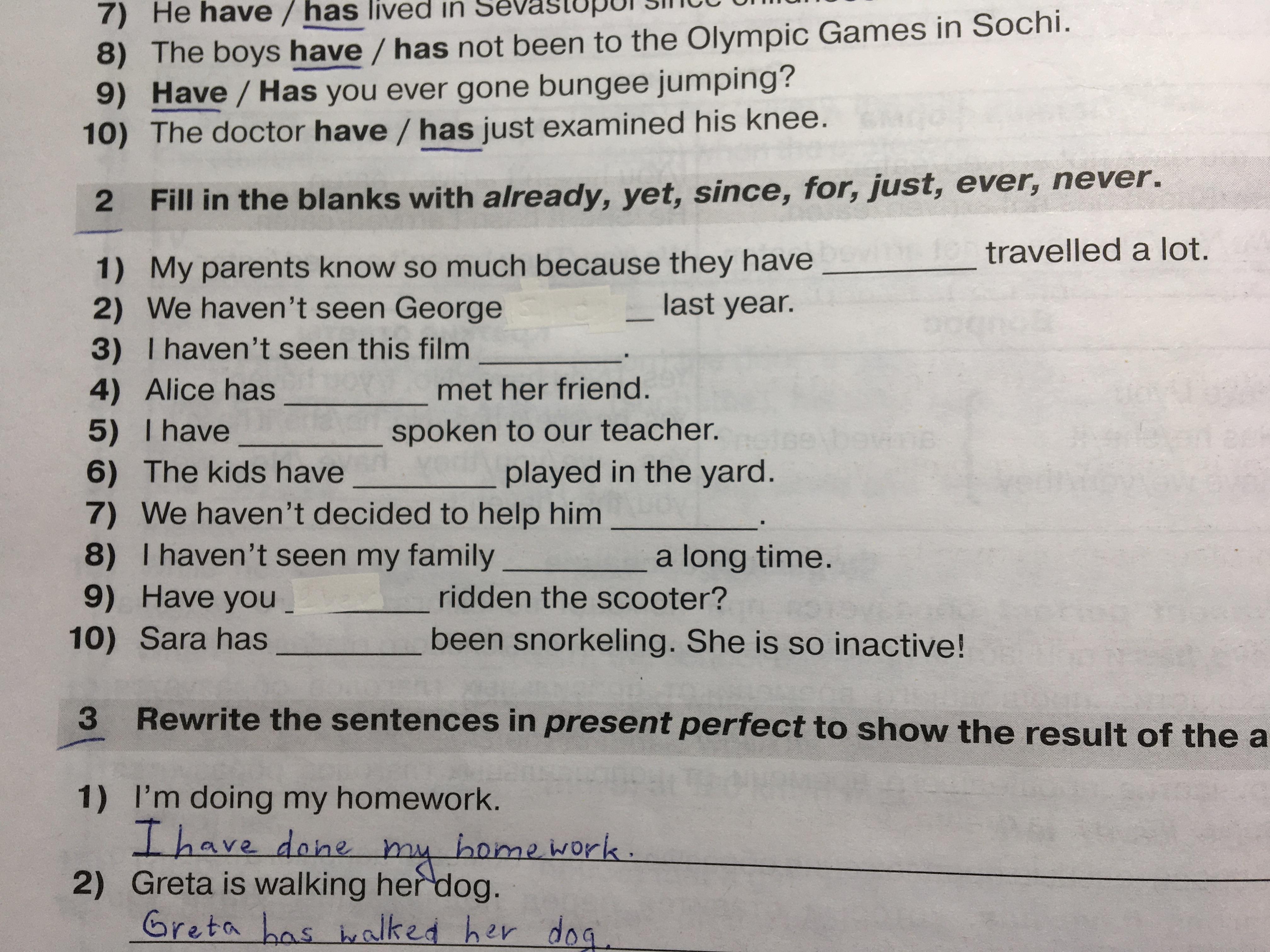 1)already 2)since 3)yet 4)just 5)for 6)never 7)yet 8)ever 9)ever 10)never