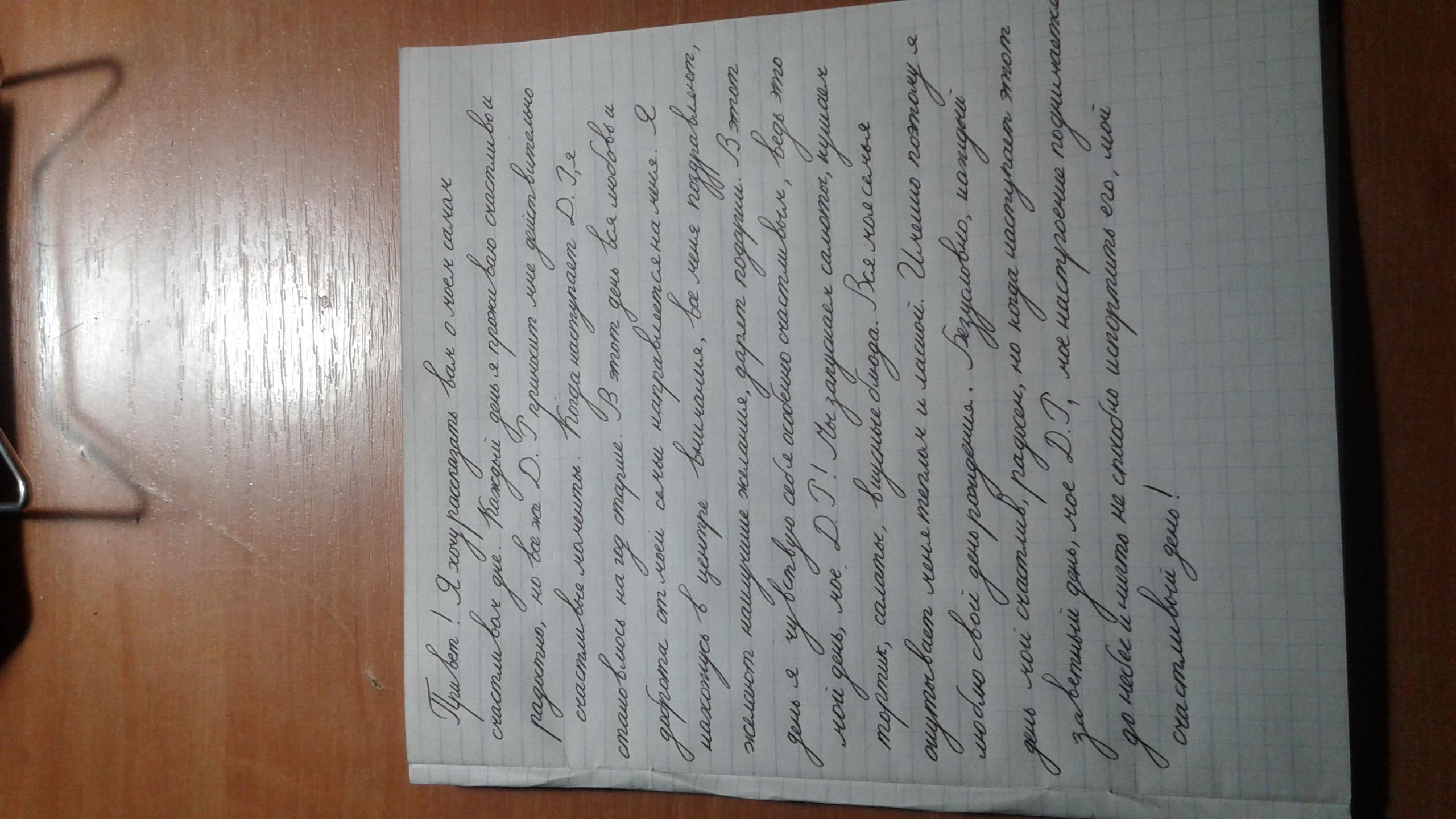 Самый счастливый день в моей жизни это моё день рождение. Там можно веселиться, а самое главное это постареть на один год. На дне рождении мы кушаем торт и много других вкусностей. Встреча с друзьями и подарки, что может быть лучше? День рождение - это день когда ты счастлив, а разве есть что-то более ценное чем счастье?