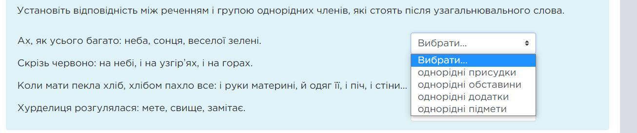 Установіть відповідність між реченням і групою однорідних членів, які стоять після узагальнювального слова.