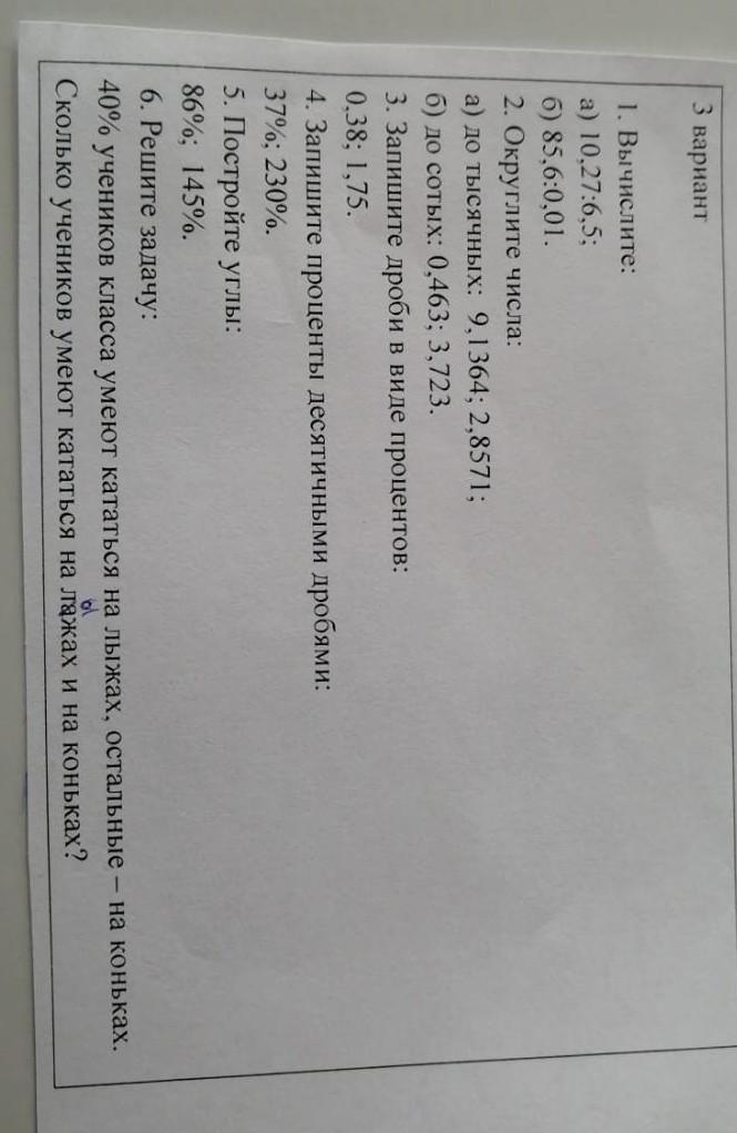 3 вариант 1. Вычислите: a) 10,27:6,5; б) 85,6:0,01. 2. Округлите числа: a) до тысячных: 9,1364;B 2,8571; б) до сотых: 0,463;B 3,723. 3. Запишите дроби в виде процентов: 0.38; 1,75. 4. Запишите проценты десятичными дробями: 37%: 230%. 5. Постройте углы: 86%; 145%. 6. Решите задачу: 40% учеников класса умеют кататься на лыжах, остальные -на коньках. Сколько учеников умеют кататься на лажах и на коньках?