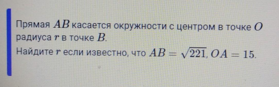 При описанных условиях точки О, А и В образуют прямоугольный треугольник, в котором сторона ОА – это гипотенуза, а сторона АВ – один из катетов. Радиус r является вторым катетом. Согласно теореме Пифагора, сумма квадратов длин катетов равна квадрату длины гипотенузы. Следовательно, длина катета r будет равна квадратному корню из разницы квадратов гипотенузы и известного катета.