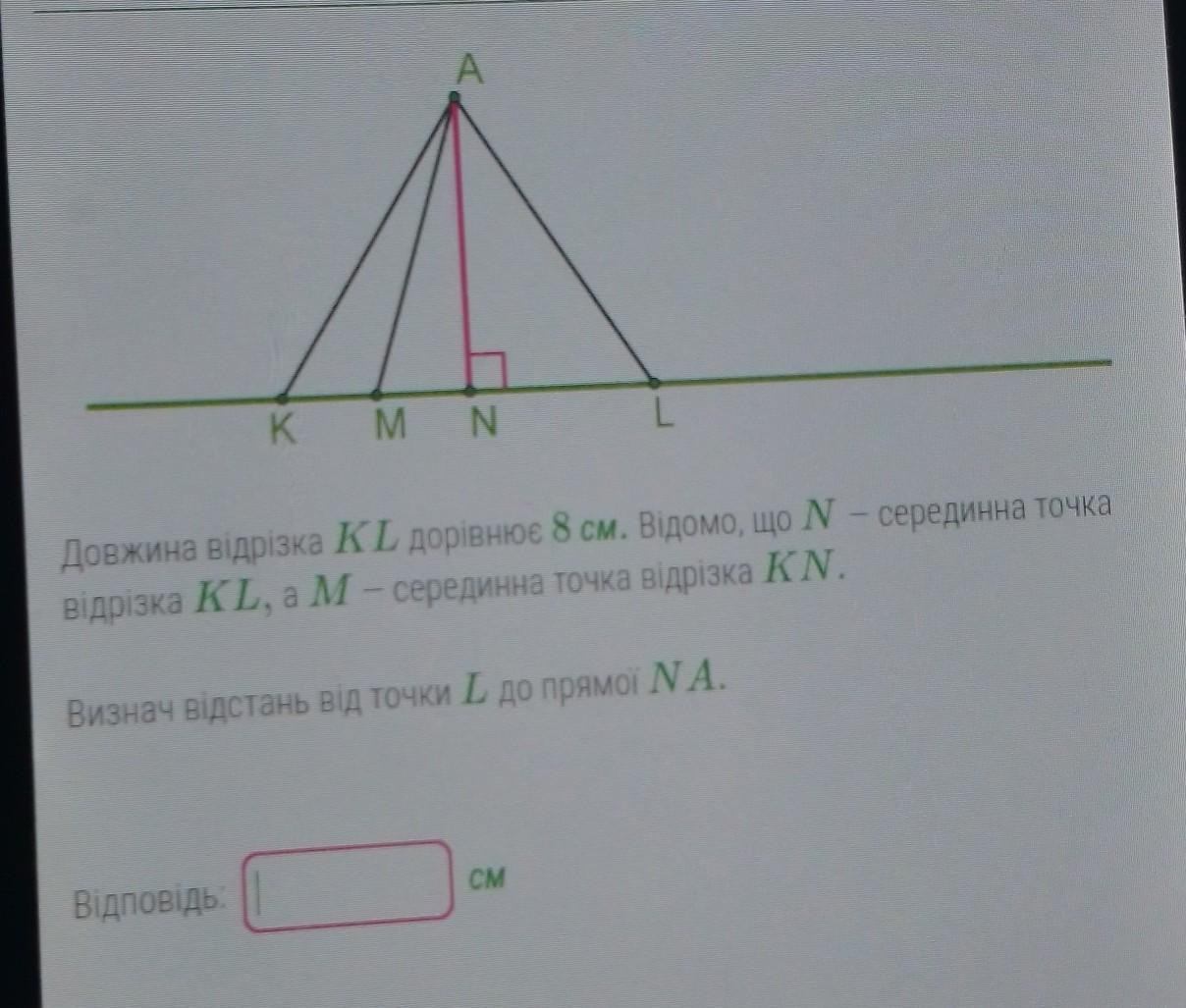 Відстань від т.L до NA-це довжина відрізка LN. N-середина KL за умовою, тоді AN- медіана трикутника KLA. NL=KN=8/2=4.