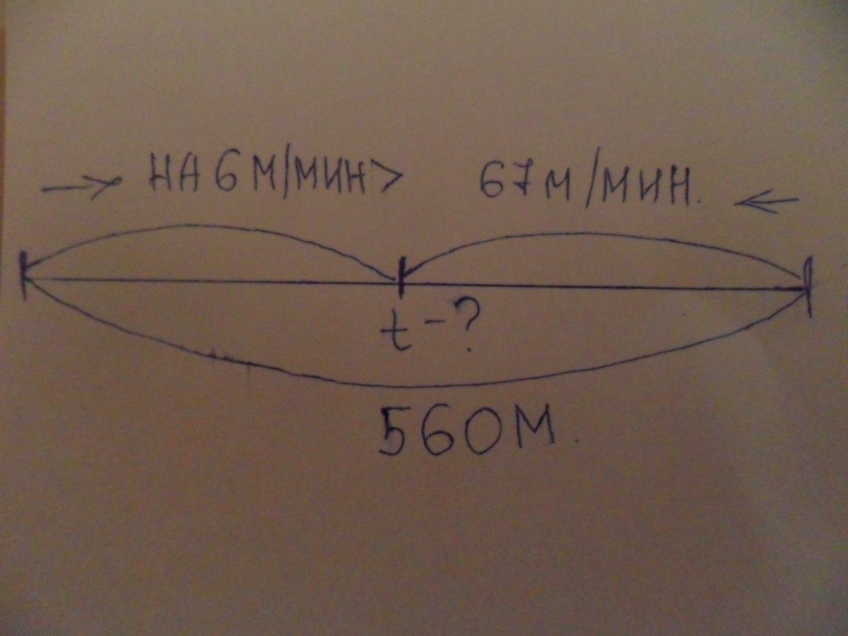 сделай чертеж к следующей задаче. по лесной тропинке навстречу друг друга одновременно выбежали два ежика. скорость одного 67 м/мин, а скорость другого на 6 м/мин, больше. Через какое время ежики встретятся, если вначале между ними было 560 м?