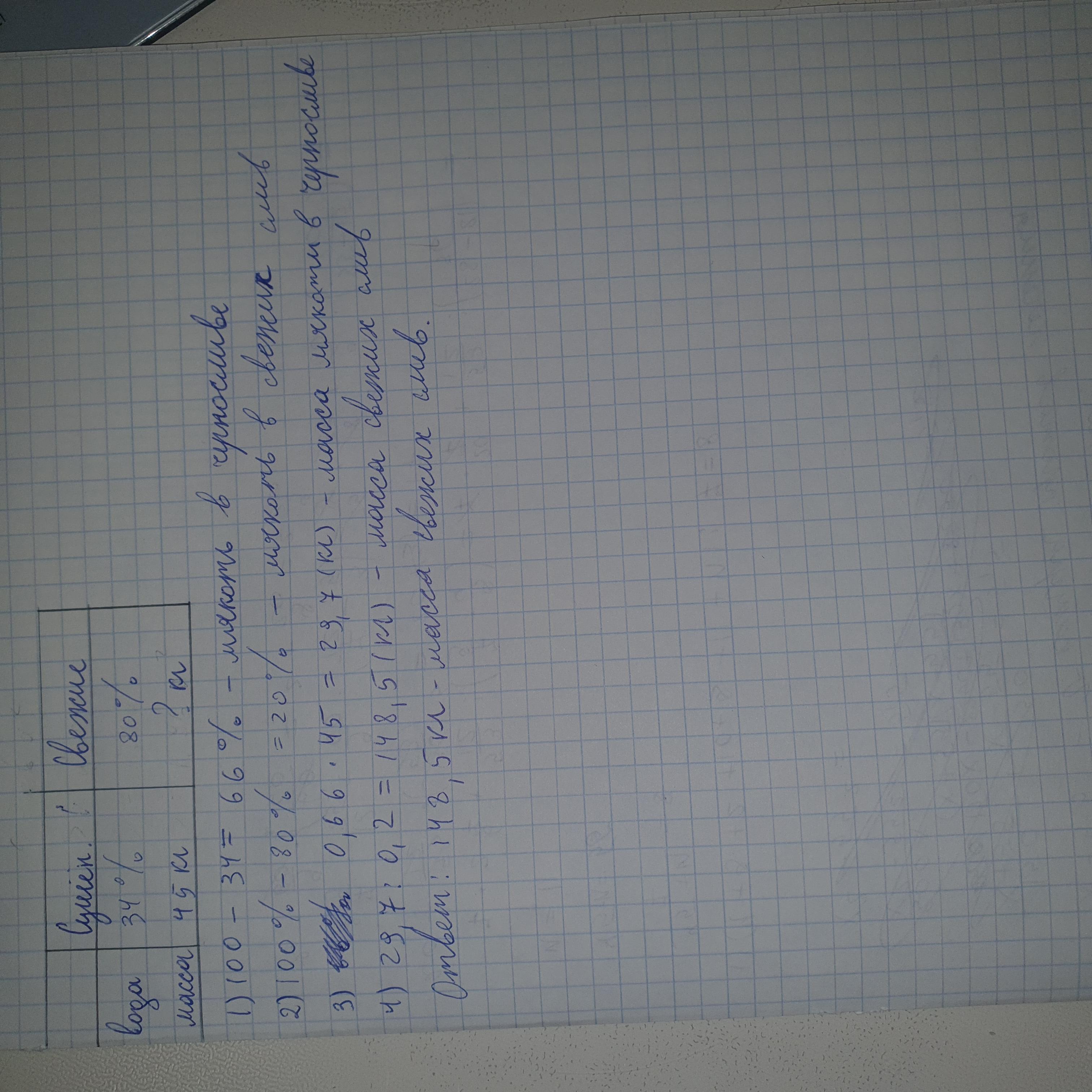 Первым действием находим мякоть в черносливе. Это та часть которая не изменяется при сушке. Т.е. 66% мякоти от массы сушенных слив равны 20% мякоти от массы свежих. Поэтому в последнем действии мы делим 29,7 кг на 0,2, чтобы найти массу свежих слив.