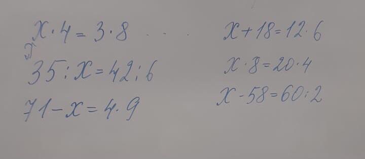 1) х*4=24 х=24:4 х=6 . 2)35:х=7 х=35:7 х=5 3)71-х=36 х=71-36 х=35 4)х+18=72 х=72-18 х=54 5)х*8=80 х=80:8 х=10 6)х-58=30 х=58+30 х=68