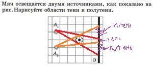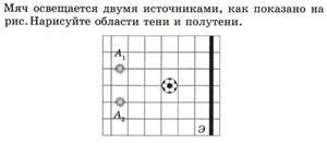 Мяч освещается двумя источниками, как показано на рис. нарисуйте области тени и полутени