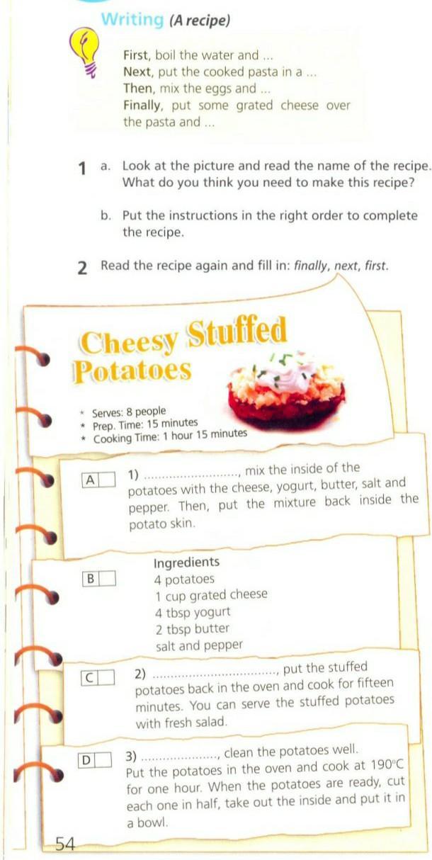 Тут рецепт картохи, сначала идут ингредиенты, затем этапы что делать. В пункте D картошку моют, чистят и отправляют в духовку. В А - делают начинку, поэтому здесь next. В конце в D достают и добавляют салат, поэтому Finally.