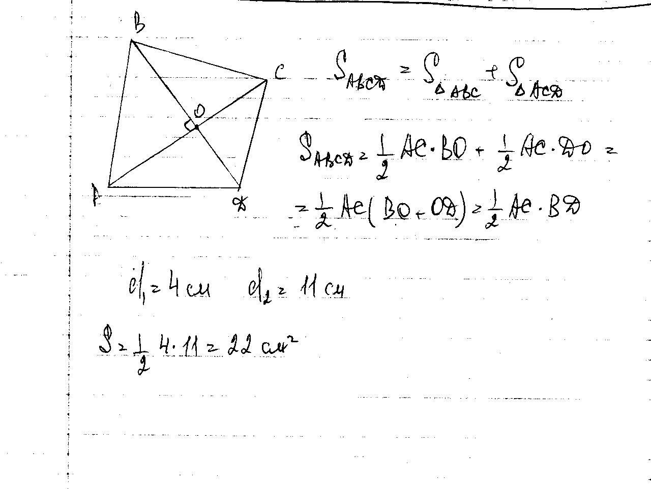 Докажите, что площадь четырехугольника равна половине произведения его диагоналей, если они перпендикулярны.