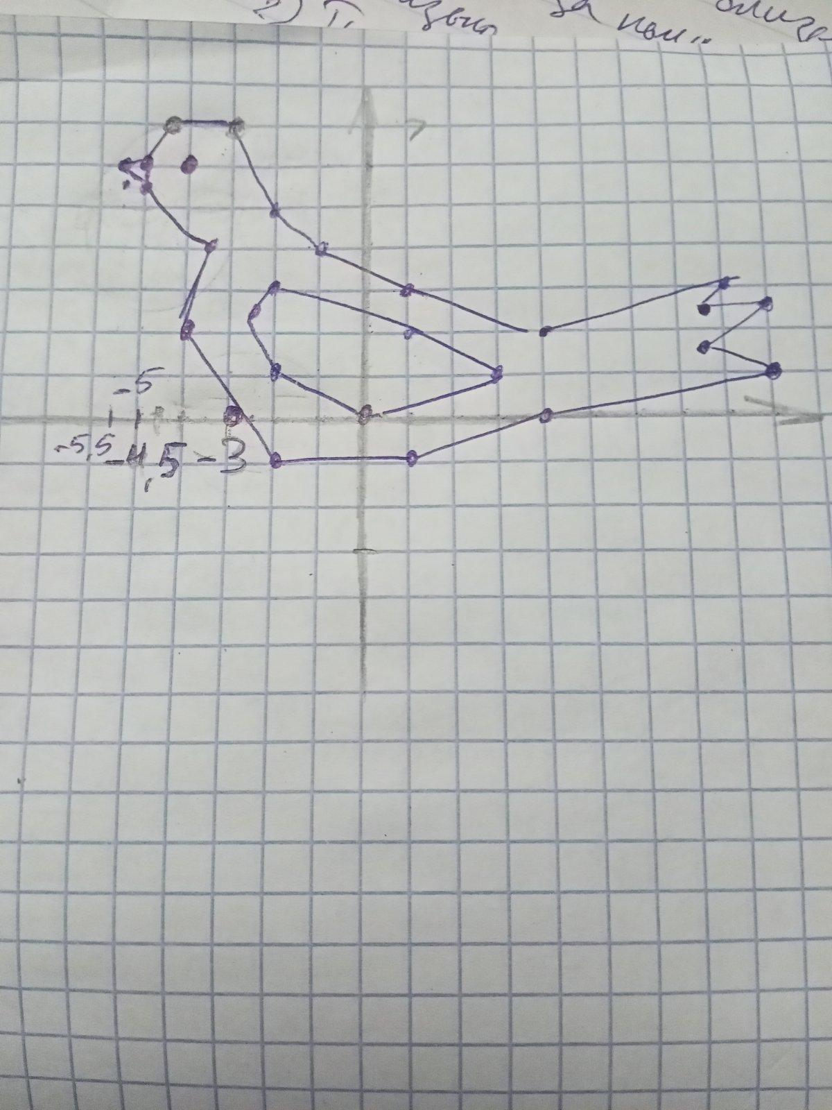 Глаз: (-4; 6). Клюв: (-5; 6), (-5,5; -5,5), (-5; -5,5). Крыло: (-2; 3), (-2,5; 2,5), (-2; 1), (0; 0), (3; 1), (1; 2).