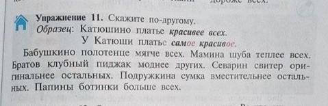 У бабушки полотенце самое мягкое. У мамы шуба самая тёплая. У брата клубный пиджак самый модный. У Севары светер самый оригинальный. У подружки сумка самая вместительная. У папы ботинки самые большие.