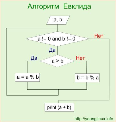 Примечание. В модуле math языка программирования Python есть функция gcd(), вычисляющая наибольший общий делитель двух чисел.