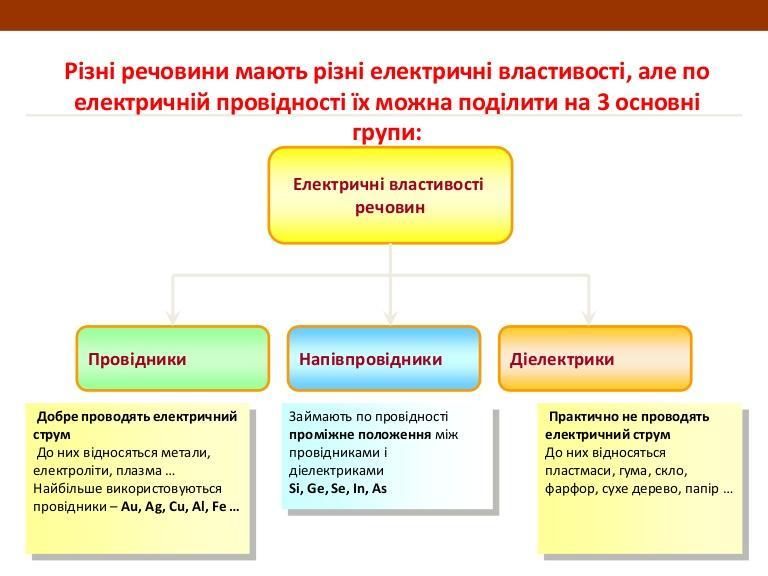 Всі матеріали по типу провідності поділяються на ТРИ типи: провідники, напівпровідники, ізолятори.
