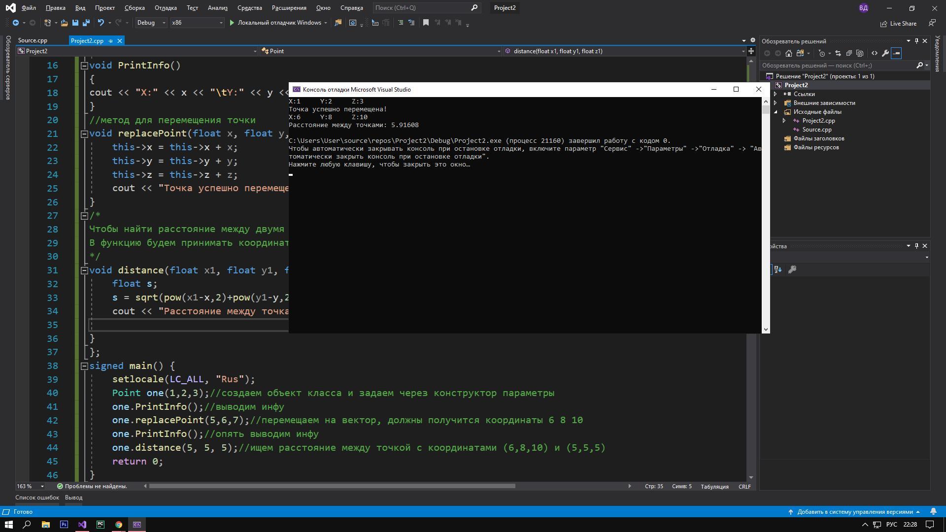 Разработать класс точка Необходимо иметь внутри класса конструктор, методы класса переместить точку на заданный вектор , Определить метод, который определяет расстояние между двумя точками . Печать данных точек .