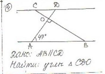 <СОД=90°, вертикальные углы. <СДО=47° внутренние накрест лежащие углы. <ДСО=90°-47°=43°