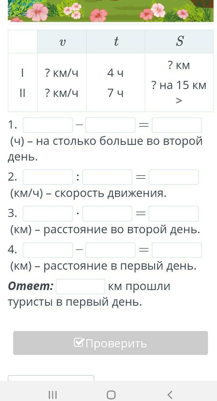 В первый день туристы были в пути 4 часа. Во второй день туристы за 7 часов прошли на 15 км больше, чем в первый день. Какое расстояние прошли туристы в первый день?
