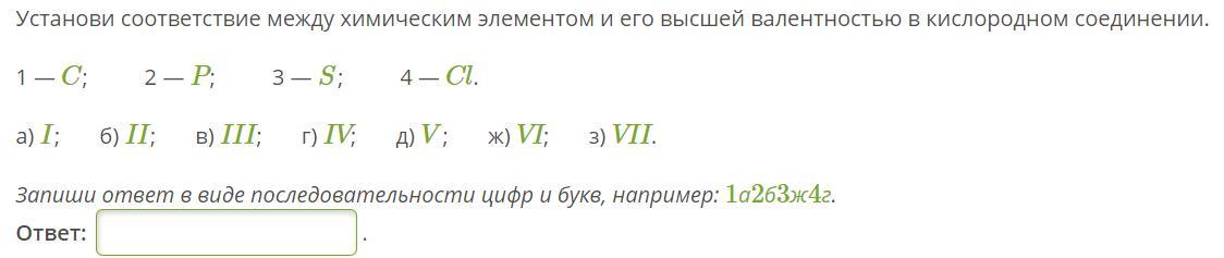 Установи соответствие между химическим элементом и его высшей валентностью в кислородном соединении.