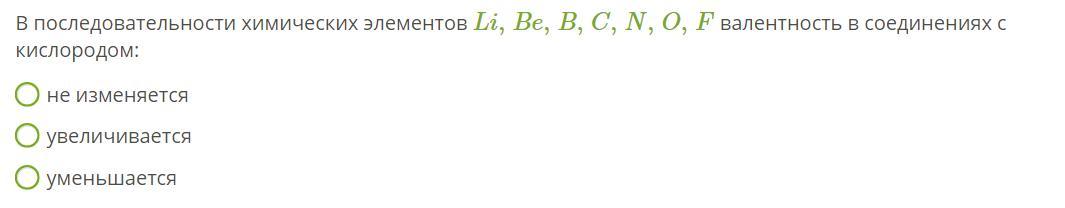В последовательности химических элементов Li,Be,B,C,N,O,F валентность в соединениях с кислородом: