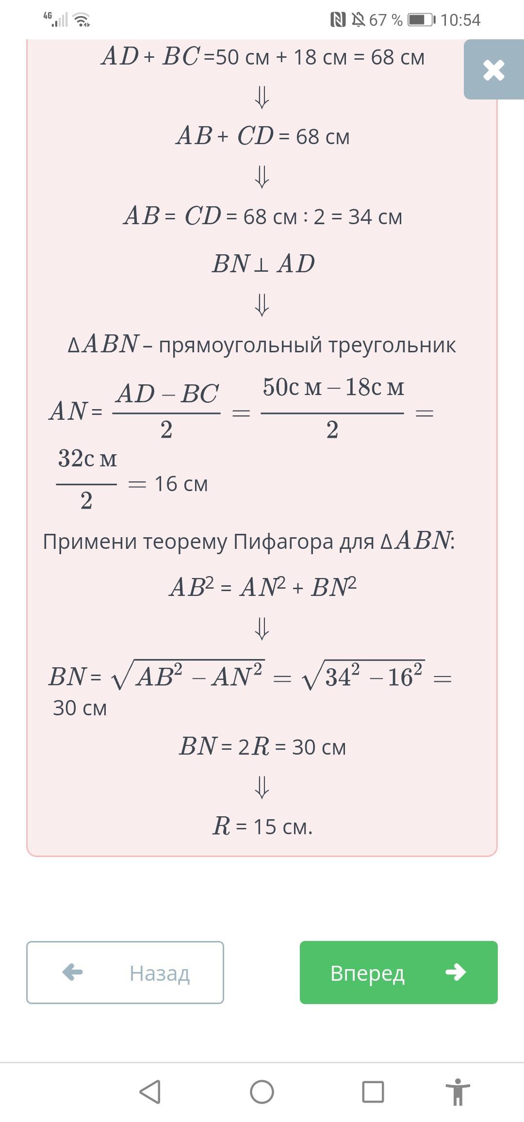 9кл В равнобедренную трапецию вписана окружность. Длины основания равны 18 см и 50 см. Определи, чему равен радиус вписанной в трапецию окружности.