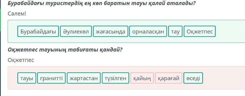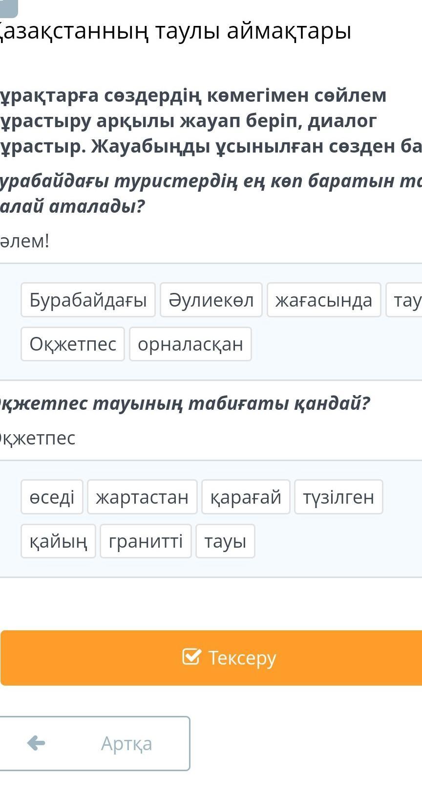 Сұрақтарға сөздердің көмегімен сөйлем құрастыру арқылы жауап беріп, диалог құрастыр. Жауабыңды ұсынылған сөзден баста.